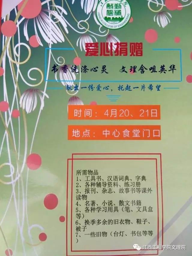 为了积极响应校团委“三下乡”活动的号召,提前做好“三下乡”的准备,同时弘扬不朽的雷锋精神,江西工程学院文理学院的志愿者们于2017年4月20-21日开展了为期两天的图书旧物捐赠活动,在中心食堂门口摆点,为捐献爱心的同学提供一个平台,将江工之爱齐聚。