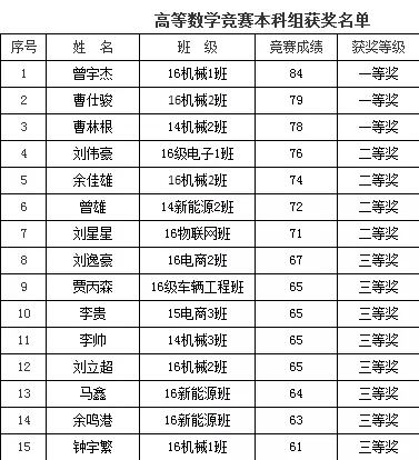 热烈祝贺文理学院的学子们在学校组织的国学竞赛和高等数学竞赛中取得了良好成绩,名单公布如下: